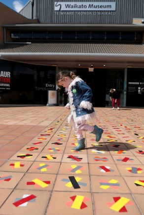 Image: Four-year-old visitor Texas Leen hops across ‘Gathering’ on Waikato Museum’s forecourt.