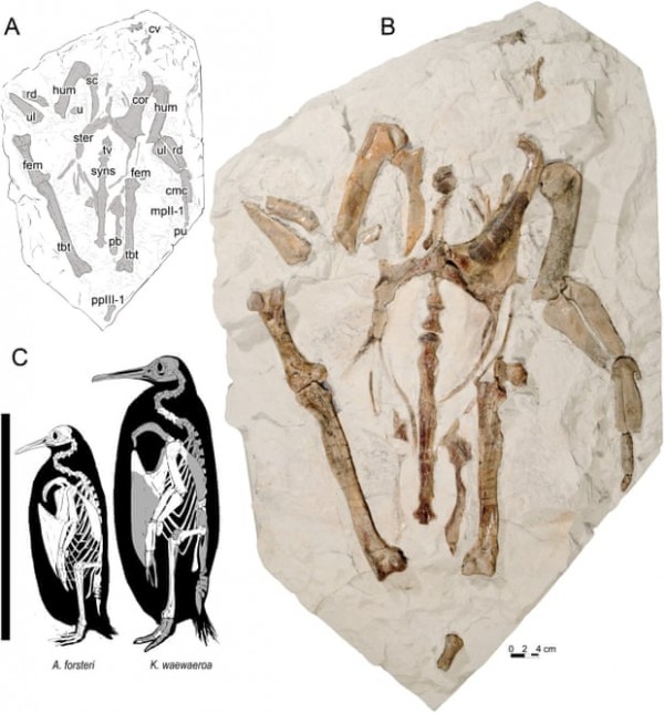 A) Line drawing of specimen; B) photo of specimen now stored at Waikato Museum; C) size comparison of Kairuku waewaeroa and an emperor penguin. Image: Journal of Vertebrate Paleontology