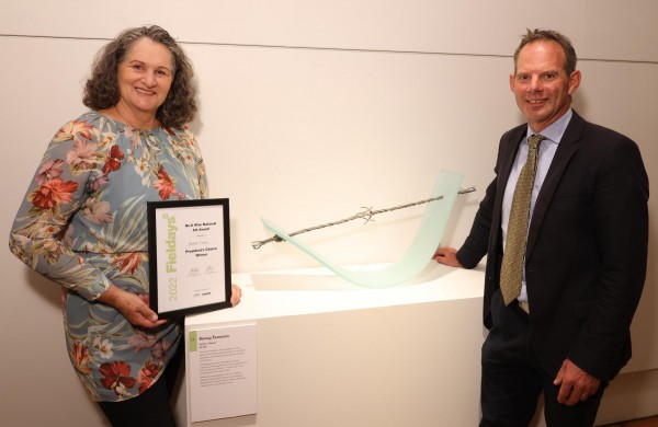 Artist Heather Olesen with her winning work Rising Tensions and NZNFS President James Allen.