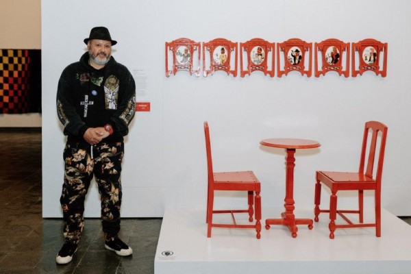 Winner of the 2023 National Contemporary Art Award, Tawhai Rickard (Ngaati Uepohatu, Ngaati Porou) with his work titled ‘Scenes from a Victorian Restaurant’.