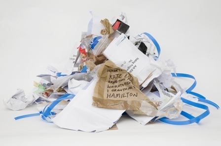 Down to Earth is the final work of My Material World Series: It includes the complete digital portrait archive of 111 slides featuring three chapters of individual and group portraits recorded during three 'MMWS' installations 2008 - 2009 (Auckland NZ / Miami USA / Culiacan Mexico). In an active mimetic play the viewers in these portraits were captured in a series of stills as they became physically involved within the changing plastic habitat of successive installations. This is the first time the finished digital portrait archive has been compiled for exhibition. The Down to Earth installation is created using a selection of disposable things; rubbish bags and common surfaces mingling with the intricate techniques of ‘Papel Picado’ pre-figured with delicate musings of native bird-life and Japanese squid patterns cutting faces into our material waste and revealing an arrival of attention towards the complex human situation in a changing world.