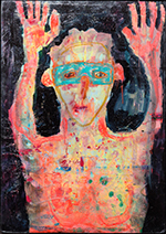 Red Handed Acrylic paint and charcoal on MDF board with collage |